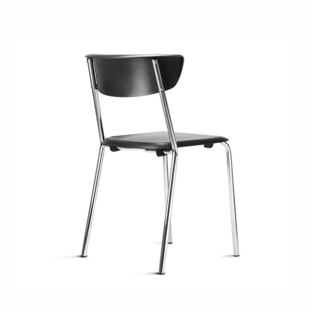 Cadeira empilhável com base fixa de aço carbono cromado ou com pintura cinza, preta e branca; Assento e encosto de polipropileno injetado;